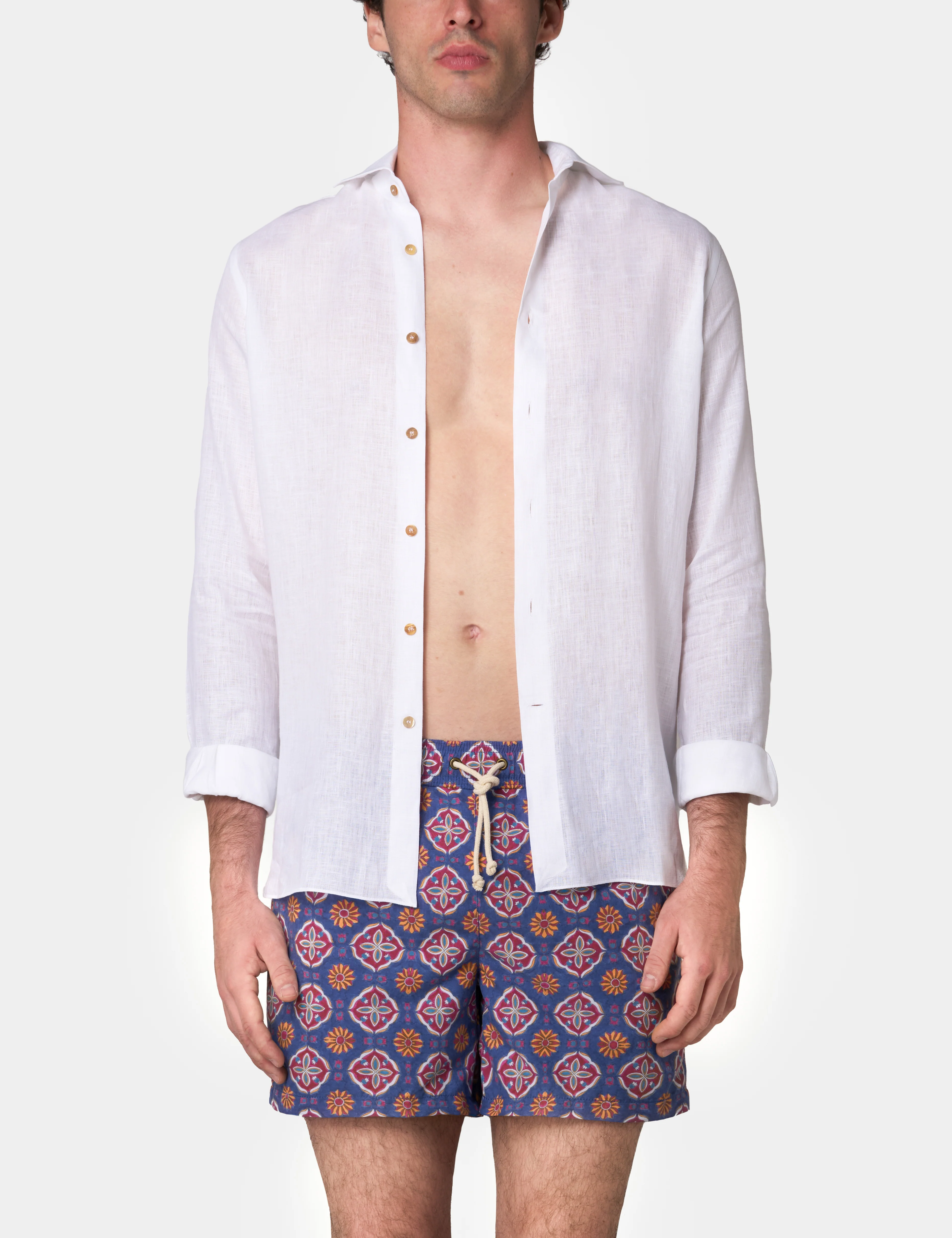 The classic swim shorts were redesigned for a more elegant, tailored look and a comfortable fit. Pattern drawn by hand. Made in Italy.